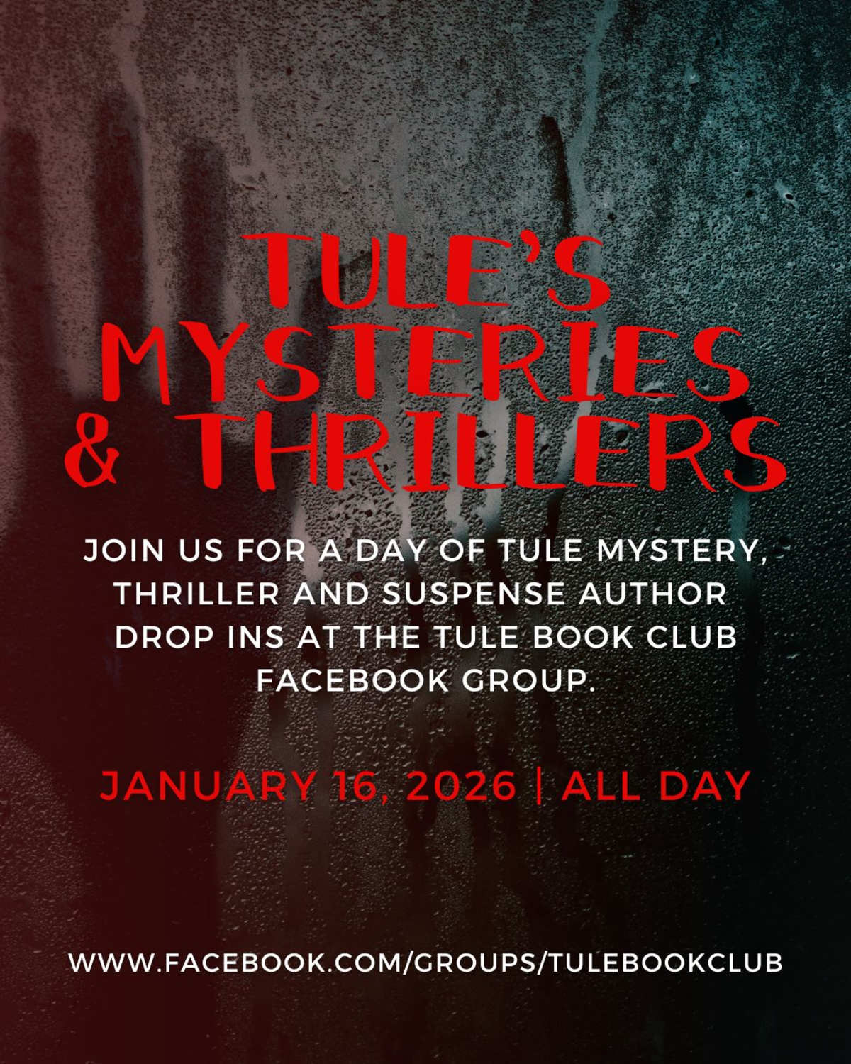 Hey, friends! Be sure to stop by the Tule Book Club next Friday, January 16, for a fun-filled day of thrillers, mysteries, and all things whodunnit! I'll be there from 6:30 to 7:00 Eastern time. Here's the link to join the fun: